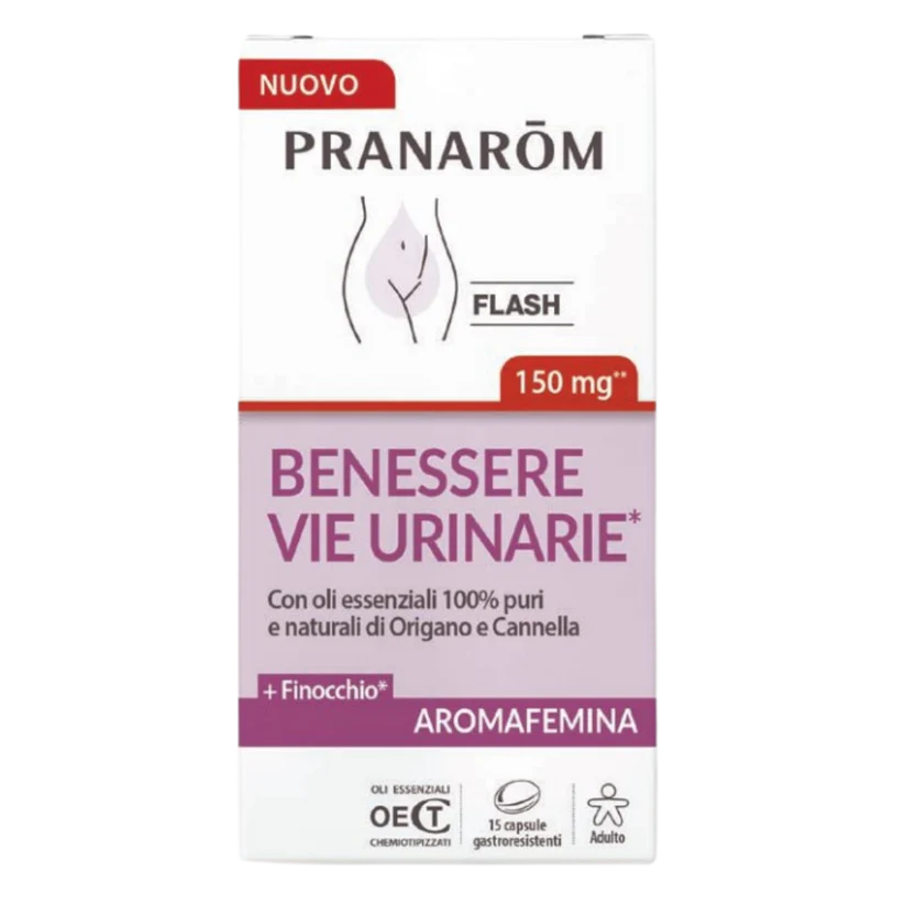 Benessere Vie Urinarie è un integratore con oli essenziali specifici per il benessere del sistema urinario. Contiene oli essenziali di Santoreggia, Lemongrass, Origano, Cannella e Limone ad azione antibatterica (es. Escherichia Coli) e antimicotica (es. Candida). Oli essenziali di Finocchio, Timo CT Timolo e Chiodi di Garofano garantiscono una rapida azione antidolorifica, antinfiammatoria, antispasmodica e diuretica.