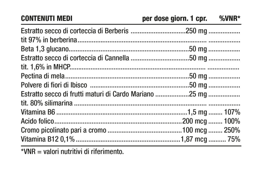 INGREDIENTI Berberis (Berberis aristata DC.) corteccia e.s. tit. 97% berberina, Agente di carica: Cellulosa microcristallina, Beta 1,3 glucano, Cannella (Cinnamomum zeylanicum Blume) corteccia e.s. tit. 1,6% MHCP, Pectina di mela, Ibisco (Hibiscus sabdariffa L.) fiori plv, Cardo mariano (Silybum marianum L. Gaertn) frutto e.s. tit. 80% silimarina, Antiagglomerante: Silice colloidale; **C2P® Tech [miscela di oligoelementi (Calcio, Cloro, Fosforo, Zolfo, Magnesio, Potassio, Sodio, Ferro, Manganese, Zinco, Rame, Selenio) in polvere, alfaciclodestrina], Antiagglomerante: Magnesio stearato vegetale; Vitamina B12 0,1% (cianocobalamina), Vitamina B6 (cloridrato di piridossina), Acido folico, Cromo picolinato.