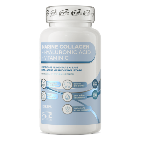 CARATTERISTICHE: Marine Collagen + Hyaluronic Acid + Vitamin C è un integratore alimentare in capsule, formulato con peptidi di collagene marino idrolizzato, acido ialuronico (ialuronato di sodio) e vitamina C, destinato a supportare i fabbisogni nutrizionali dell’organismo.