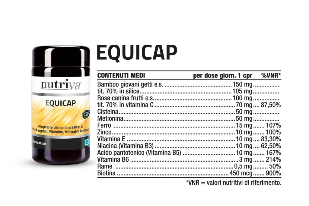 NUTRIVA EQUICAP è un integratore alimentare a base di Estratti Vegetali, Vitamine, Minerali e Aminoacidi, arricchiti con Bamboo e Zinco, utili al mantenimento di unghie e capelli normali. Con Rame utile per la normale pigmentazione dei capelli.