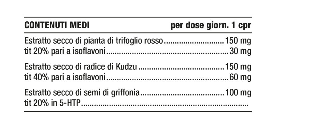 INGREDIENTI: Agente di carica: Cellulosa microcristallina; Trifoglio rosso (Trifolium pratense L.) pianta e.s. tit. 20% in isoflavoni, Kudzu (Pueraria lobata DC Willd) radice e.s. tit. 40% in isoflavoni, Griffonia (Griffonia simplicifolia DC Baill) semi e.s. tit. 20% 5-HTP, *C2P® Tech [miscela di oligoelementi (Calcio, Cloro, Fosforo, Zolfo, Magnesio, Potassio, Sodio, Ferro, Manganese, Zinco, Rame, Selenio) in polvere, alfaciclodestrina] 1%, Antiagglomeranti: Silice colloidale, Magnesio stearato vegetale.
