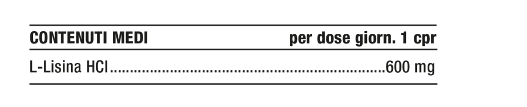 INGREDIENTI: L-Lisina monocloridrato, Agente di carica: Cellulosa microcristallina; Agente antiagglomerante: Silice colloidale; *C2P® Tech [miscela di oligoelementi (Calcio, Cloro, Fosforo, Zolfo, Magnesio, Potassio, Sodio, Ferro, Manganese, Zinco, Rame, Selenio) in polvere, alfaciclodestrina]; Agente antiagglomerante: Magnesio stearato vegetale.