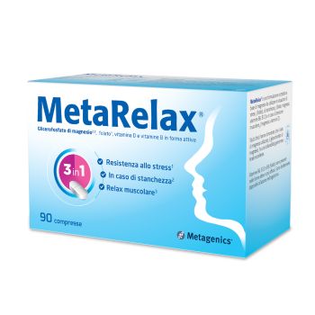 MetaRelax® è una formulazione completa a base di magnesio da utilizzare in situazioni di stress (folato), di stanchezza (folato, magnesio, vit. B6, B12) e in caso di tensione muscolare (magnesio, vit. D).