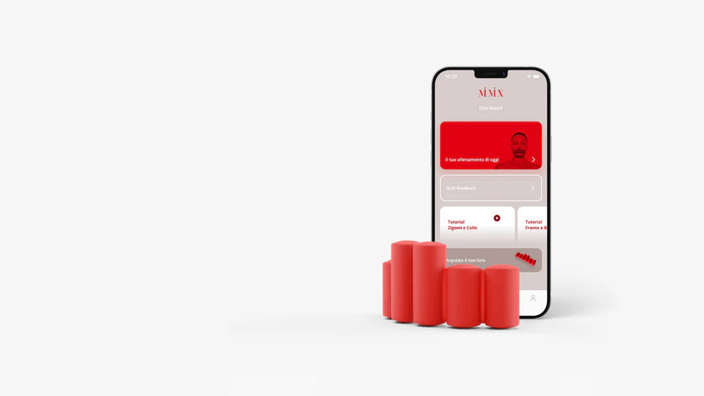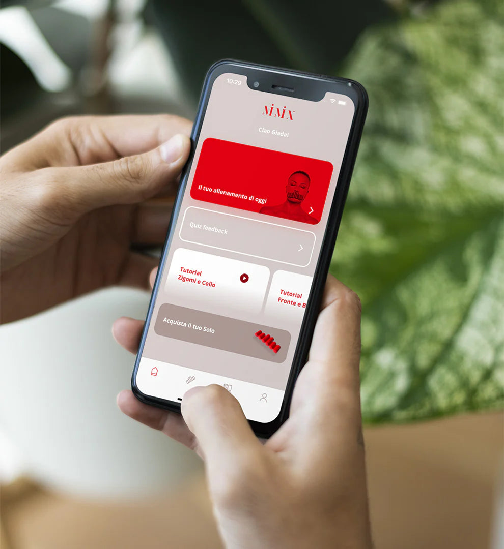 Il primo peso libero facciale brevettato per allenare i muscoli di viso e collo comodamente guidati dall’App Mimix Life.